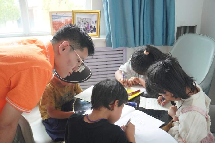 圖為實(shí)踐隊(duì)隊(duì)員為社區(qū)小朋友講解作業(yè) 劉赟澤攝