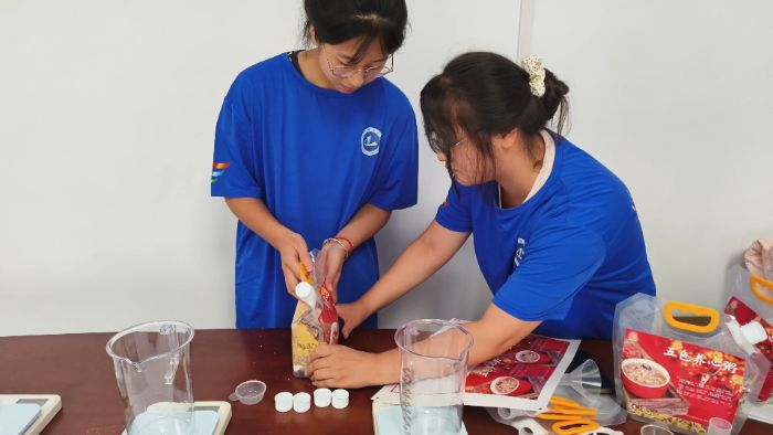 在良西莊村,實踐團成員們親自動手進行初產品的包裝:首先精準稱量各類谷物原料,隨后倒入食品級包裝袋中,最后貼上包含產品名稱、成分、營養信息的標簽。整個流程規范有序,展現了學生們的專業素養。