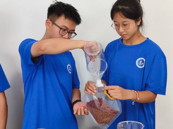 圖為實踐成員將稱量好的谷物倒入包裝袋中。周夢杰攝