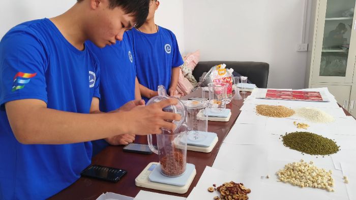 7月5日,生命科學與工程學院“青耘良西-青春興農實踐團”在駐地開展產品轉化實踐。基于7月4日初步確定并經過試喝的“五色養心粥”營養配方及比例,團隊成員進行了原料采購,并按標準配置、封裝了三斤裝與五斤裝兩種規格的產品。