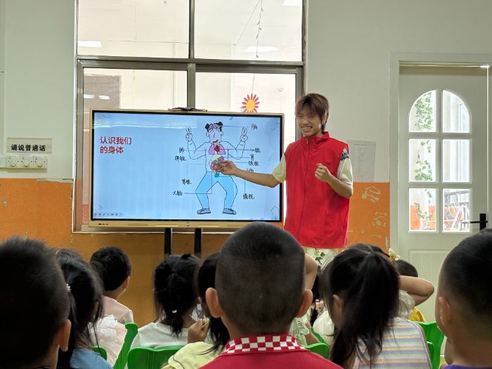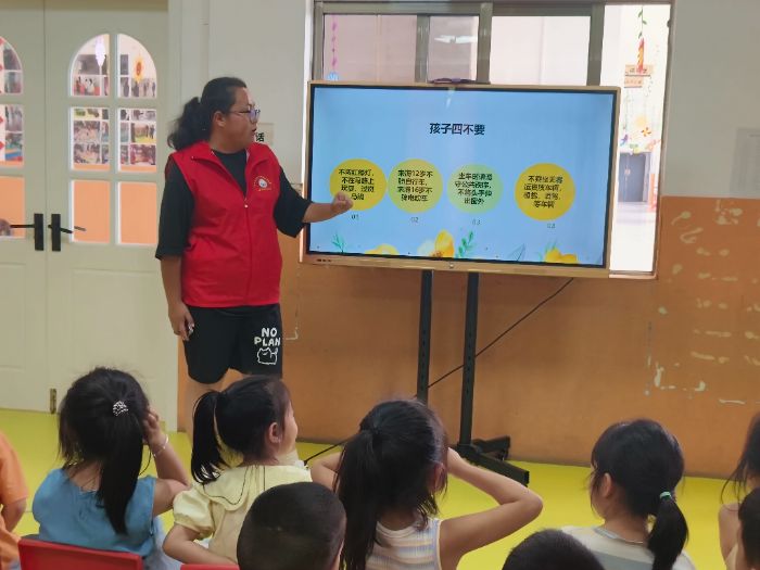 活動中,實踐團成員化身“安全小導師”,針對鄉村兒童常見的潛在風險,精心設計了一系列生動有趣的課程。實踐團成員巧妙運用趣味動畫、情景模擬等孩子喜聞樂見的形式,將防溺水、防性侵、交通安全等重要的安全知識融入簡單易懂的小故事中。志愿者們為當地兒童有效識別危險、預防意外筑牢了知識屏障。