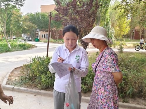 實踐團成員向居民耐心講解問卷目的與填寫要求,圍繞阿拉爾本地耐旱植物知曉度、“植物小課堂”興趣點、對兵團墾荒故事及精神的理解等問題展開調查。從居民認真填寫的問卷調查中,既能了解到大家對胡楊、沙棗等耐旱植物的認知情況,也能洞察其對植物科普、親子種植等社區植物相關設施的期待,以及對兵團精神在生活中體現的看法。