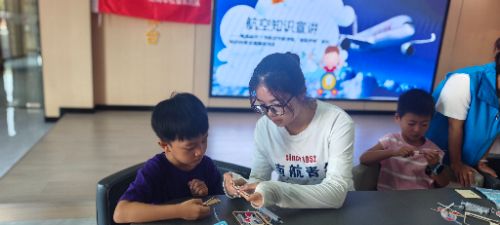 (圖13)實踐隊員在進行航空知識科普 (圖14)實踐隊員在教小朋友們做航模