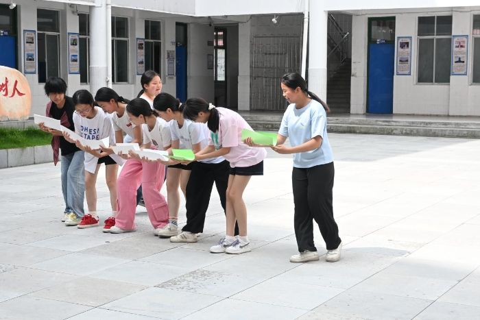 運動會現場,各項目設計巧妙融合競技與趣味,考驗學生體力與團隊默契,乒乓球接力比賽率先登場。將學生分為六組,兩兩比拼,游戲規則是需用卡紙托球運輸,途中稍有晃動便需從頭再來。學生們屏息凝神,有些小組快步疾走,有些小組小心翼翼挪動,緊張與趣味交織。