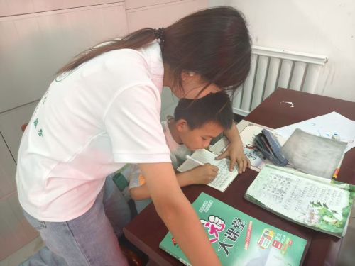 上午,實(shí)踐團(tuán)成員化身“知識(shí)引路人”,針對(duì)孩子們暑期作業(yè)的重難點(diǎn)展開輔導(dǎo)。在數(shù)學(xué)輔導(dǎo)中,成員用“分西瓜”的生活場景,拆解分?jǐn)?shù)運(yùn)算難題,讓抽象數(shù)字變得直觀易懂;語文課堂里,引導(dǎo)孩子把花橋新村的植物見聞融入作文,讓文字有了“泥土氣”和“生活味” ;英語學(xué)習(xí)時(shí),通過“植物英文命名大挑戰(zhàn)”,激發(fā)孩子單詞記憶熱情。輔導(dǎo)過程中,成員們針對(duì)不同孩子的學(xué)習(xí)節(jié)奏,定制專屬解題路徑,從糾正書寫習(xí)慣到梳理知識(shí)框架,一步步幫孩子找回學(xué)習(xí)自信,不少孩子主動(dòng)提問的次數(shù)明顯增多,求知欲持續(xù)升溫。
