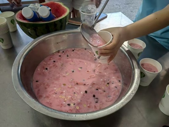 餐畢,后勤組的成員們?cè)缫褌浜皿@喜——自制的西瓜椰椰飲品。冰爽的椰汁滑過喉嚨,帶著西瓜的清甜與椰果的Q彈嚼勁,一口下去暑氣全消,隊(duì)員們喝得眉眼彎彎,連連拍手叫好,幸福感在舌尖悄然蔓延。