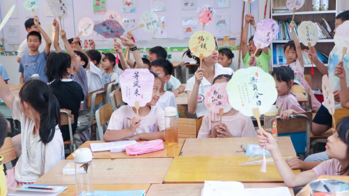 “扇面飄漆”環(huán)節(jié)進一步提升了活動的趣味性與參與度。孩子們輕壓扇面入水,觀察漆色花紋順著水流“爬”上扇面,形成各具特色的圖案:有的如晚霞漫染,呈現(xiàn)出“紫氣東來”的天然意境;有的似藍天白云,孩子們在其上增添“等風(fēng)來”的字樣,寄托對清涼的期盼;還有的被繪上“滿帆起航”的圖案,傳遞出勇敢無畏的精神。每一把扇子都成為孩子們內(nèi)心世界與千年技藝共鳴的見證,實現(xiàn)了童真與傳統(tǒng)的深度融合。