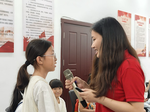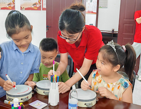 圖為實踐隊隊員在洋尾村黨群活動中心輔助小朋友們鼓面繪畫創作。鄭文昕 供圖