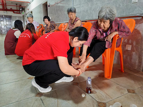 圖為實踐隊隊員在晉江市洋尾村敬老院為老人進行穴位按摩。鄭文昕 供圖