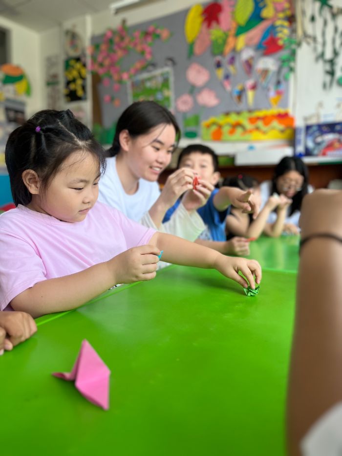 “浪花姐姐來啦!”伴隨著志愿者的生動開場,孩子們首先用一張藍色卡紙折出“奔涌浪花”。對折、翻角、壓線,志愿者邊示范邊講述壺口瀑布的轟鳴與黃河奔流的壯闊。小朋友們舉起剛完成的浪花模型,奶聲奶氣地說:“我把大海搬進了教室!”緊接著,志愿者引導孩子們用彩紙折疊“遷徙候鳥”,從丹頂鶴的細長脖頸到黑嘴鷗的舒展翅膀,每一步都穿插著黃河三角洲鳥類保護小故事。孩子們一邊為紙鳥畫上眼睛,一邊學唱“小鳥飛回黃河口”童謠,現場一片歡聲笑語。