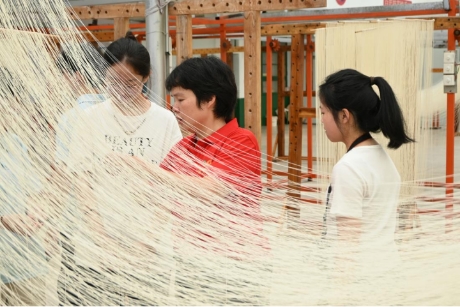 圖為非遺工坊內,一排排面線掛在曬架上進行晾曬,場面壯觀。 施宇涵 攝