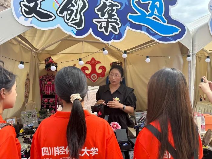 實踐首站,團隊來到中國古羌城,沉浸式感受羌族文化的獨特魅力。在文創(chuàng)店鋪內,刺繡精美的傳統(tǒng)服飾、紋樣別致的民族飾品讓人目不暇接,店主通過一件件手工藝品,講述著羌族先民對自然的敬畏與對生活的熱愛。“我們鼓勵學生將現(xiàn)代設計理念融入傳統(tǒng)羌繡,讓老技藝跟上新潮流。”阿壩職業(yè)學院的陳老師介紹,師生共同設計的羌繡筆記本、金屬書簽等文創(chuàng)產品已進入市場調研階段,部分還申請了專利。