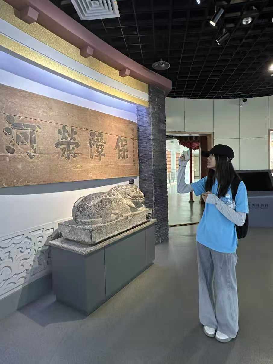 訪談中,村民們深情講述和尚莊與黃河共生的故事:從過去 “壩上人家” 汛期擔驚受怕,到2000年全村整體搬遷住進規劃新村;從昔日黃河大堤 “窄陡泥濘”,到如今 “加寬綠化、宛如公園”;從依賴黃河航運謀生,到水閘修建解決灌溉難題實現 “四季不缺水”…… 這些變遷生動展現了黃河治理的民生溫度。同時,村民們也提出期待:希望引入力量承包開發黃河游覽區,規范引導村民擺攤經營,讓黃河生態資源更好轉化為鄉村發展效益,實踐團認真記錄訴求,計劃納入后續調研報告。 探場館、傳文化,挖掘黃河精神時代價值為系統梳理黃河文化脈絡,實踐團走進鄭州市黃河博物館。館內豐富的文物展品、歷史文獻、河道示意模型與照片墻,全方位呈現了黃河流域的文化起源、防汛工程建設與現代化數字治理成果。成員們駐足觀看古樸的黃河號子與羊皮筏實物,圍繞 “黃河孕育的歷史文明”“當前生態問題及應對” 展開熱烈討論,收集了大量一二手資料,深化了對 “黃河寧,天下平” 厚重內涵的理解。