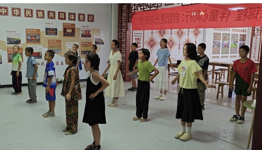 孩子們立刻被吸引,跟著志愿者逐句學習。起初動作有些生疏,手臂擺動不協調,志愿者們便分組指導,耐心糾正細節:幫孩子調整手指的角度,示范手臂擺動的幅度,還特意放慢節奏,讓大家跟上歌詞與動作的配合。漸漸地,孩子們越來越熟練,從單個動作的模仿,到連貫的段落練習,再到跟著音樂完整跳完,認真的神情里滿是投入。