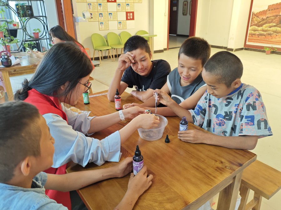 志愿者們穿梭其間,耐心提供幫助:幫力氣不足的孩子拉緊橡皮筋,為糾結配色的孩子推薦“藍白經典”“粉紫漸變”等方案,給折疊不平整的孩子調整角度。染缸前,孩子們小心翼翼地將綁扎好的方巾浸入染料,看著白色布料慢慢吸飽色彩,從邊緣到中心漸漸暈開,眼中滿是期待。等待染料滲透時,大家圍坐在一起,分享自己的設計想法,猜測拆封后的成品模樣,課堂里滿是歡快的討論聲。