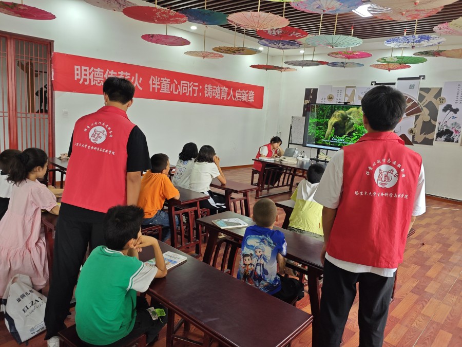 活動伊始,志愿者們以“一群特殊的‘旅行家’”為引,拉開宣講序幕。通過圖文與短視頻結合的形式,生動還原西雙版納亞洲象的遷徙歷程:從象群離開棲息地開始漫長旅途,到途經村莊時與人類的溫暖互動——村民主動投喂香蕉、玉米,為象群讓路;工作人員用無人機監測、設置臨時飲水點,全程守護象群安全;最終象群在人類的守護下,順利返回適宜的生存環境。一幅幅畫面、一段段故事,讓孩子們仿佛跟隨象群走完了這段特殊的旅程。
