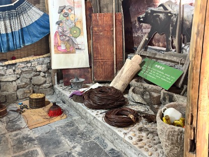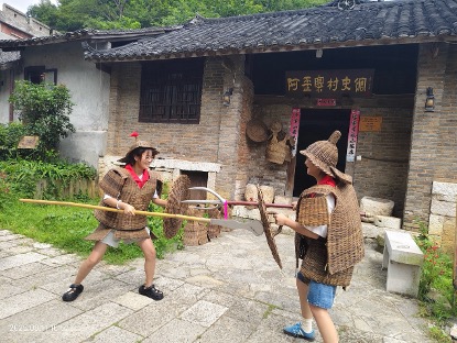 在村史館中,隊員們見到了保存完好的傳統藤甲。這些藤甲不僅是歷史的見證,更是布依族人民智慧與勇氣的象征。團隊成員親自試穿了藤甲服飾,沉重而堅韌的觸感讓大家瞬間穿越回那個藤甲兵縱橫馳騁的年代。隨后,大家模擬了藤甲兵的打斗動作,雖然略顯笨拙,但那份對歷史的敬畏與好奇卻溢于言表。通過模擬打斗,成員們深刻體會到了先民們為保衛家園所付出的艱辛。