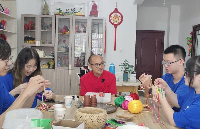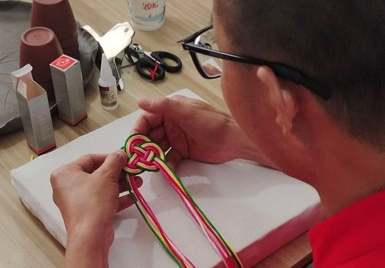 在技藝展示環(huán)節(jié),楊文藝?yán)蠋煬F(xiàn)場(chǎng)演示了平結(jié)、十字結(jié)、吉祥結(jié)等基礎(chǔ)技法。五彩繩線在他手中靈動(dòng)翻轉(zhuǎn)、纏繞,仿佛被賦予生命,片刻間便化作一個(gè)個(gè)精致規(guī)整的繩結(jié)。團(tuán)隊(duì)成員圍站四周,目光緊鎖老師的雙手,生怕錯(cuò)過任何一個(gè)細(xì)節(jié),。楊老師放慢動(dòng)作、細(xì)致拆解步驟,用通俗易懂的講解,讓繩編技藝的奧秘層層鋪展。進(jìn)入實(shí)操環(huán)節(jié),成員們紛紛上手嘗試。楊老師穿梭在成員間,俯身指導(dǎo)、親手示范,幫大家理順繩線、糾正手法。在老師的耐心幫扶下,成員們漸入佳境,指尖與繩線的摩挲間,大家不僅觸摸到繩編技藝的獨(dú)特魅力,更深刻體會(huì)到非遺傳承背后,匠人們?nèi)諒?fù)一日的艱辛與執(zhí)著。