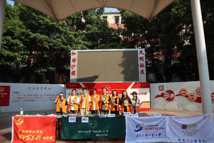 烈日下的集結:科普攤位引好奇八月的廣州,周末午后的陽光依然熾烈。堇熙11.0服務隊的隊員們早早抵達沙園街道廣重廣場,在街道工作人員的支持下,迅速而有序地布置起活動場地:支起桌臺、懸掛起醒目的“廣東青年大學生百千萬工程突擊隊”和“廣東外語外貿大學堇熙11.0服務隊”隊旗、擺放好精心準備的宣傳物料和活動獎品。他們忙碌的身影很快吸引了廣場上休閑納涼居民的目光。一位搖著蒲扇、身著背心的老伯用粵語好奇地詢問:“靚仔靚女,你哋系度做咩啊?(你們在這里做什么呀?)”隊員們擦去額頭的汗水,笑著回應:“阿伯,馬上就知道啦,是關于環保和金融的活動!”