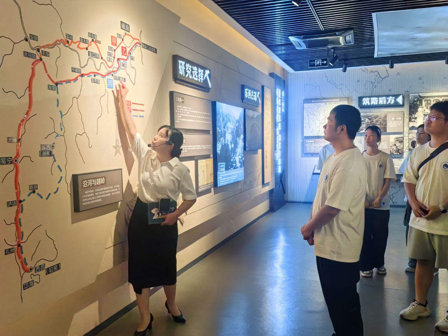 研學活動最后,實踐團走進莊嚴的樂西抗戰(zhàn)公路紀念館。銹蝕的鋼釬、泛黃的圖紙、磨破的工裝將隊員們拉進那段烽火彌漫的艱苦歲月。據(jù)講解人員介紹,樂西公路是抗日戰(zhàn)爭時期的重要生命線,峨邊路段每公里就有8名建設者犧牲。在寒冬臘月里,筑路鄉(xiāng)民們赤足踏雪,在懸崖峭壁間用血肉之軀鑿出生路。館內浮雕墻生動再現(xiàn)了當年筑路場景:一錘一釬鑿通絕壁,一血一汗鑄就生命要道,民工肩扛巨石攀爬棧道、不懼風雨筑路的畫面清晰可見。此次參觀讓實踐團成員深切感悟到先輩們的奉獻與擔當,為大家奠定了堅實的紅色精神思想基礎,進一步凝聚起堅定的理想信念。
