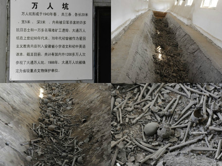 患病礦工死亡后,日軍強迫其他礦工組成拉尸隊,用筐抬、用牛車?yán)瑢⑹w拋棄在南山腳下。一時間,南山腳下尸體堆積如山,慘不忍睹。據(jù)當(dāng)時日本礦務(wù)局極不完全且大大縮小的統(tǒng)計,這里共埋了 1.3 萬多具礦工的尸體。1943 年春,為了掩蓋他們的滔天罪行,日本侵略者強令工人在大通礦的南山邊挖了 3 個大坑,將這些礦工的尸骨統(tǒng)統(tǒng)拋入坑中掩埋。這 3 個大坑,便是如今讓世人觸目驚心的淮南大通礦 “萬人坑”。此后,凡是有死人,甚至有些還未斷氣的礦工,都被拖去埋進(jìn)了 “萬人坑”。