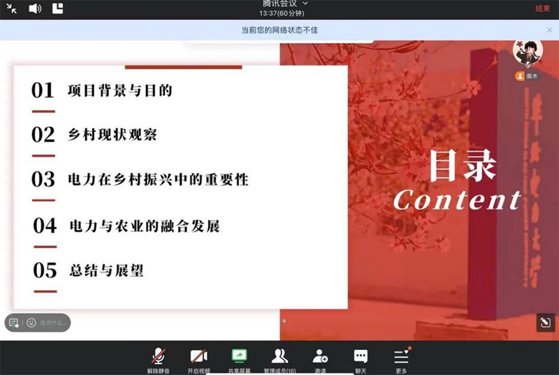 2.線上分享,知識普及促發展 基于實地調研的第一手資料,項目團隊迅速集結力量,精心策劃并舉辦了一場別開生面的線上PPT分享盛會。特邀鎮政府干部及部分村民參與,旨在搭建一個交流互鑒的平臺。分享會上,團隊成員主要從“鄉村現狀觀察”“電力在鄉村振興中的重要性”和“電力與農業的融合發展”等方面展開,他們不僅展示了鄉村現狀的真實面貌,剖析了電力資源如何成為驅動鄉村經濟發展的關鍵要素,還創新性地提出了電力與農業產業融合發展的具體策略與案例,力求為鄉村的全面振興貢獻出既接地氣又具前瞻性的智慧火花與實操指南。