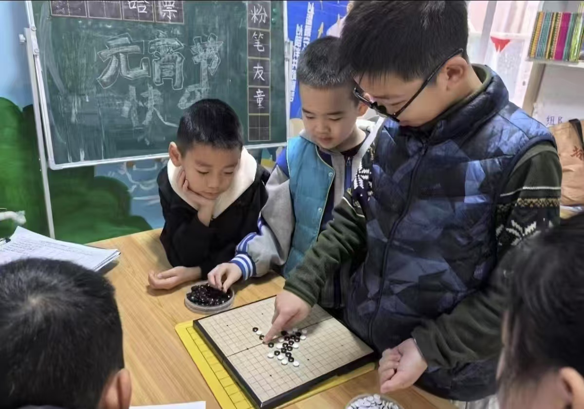 課間萬象:棋盤上的智慧交鋒課間休息時間,孩子們像一群快樂的小鳥,飛向了活動區。他們有的下起了圍棋,有的玩起了五子棋。老師也加入了他們的行列,和孩子們一起沉浸在這些有趣的游戲中。圍棋的棋盤上,孩子們認真思考,每一步都小心翼翼;五子棋的對局中,孩子們歡聲笑語,互相切磋。孩子們還在老師的帶領下玩起了腦筋急轉彎,他們積極搶答,思維活躍。這些游戲不僅鍛煉了孩子們的思維能力,也增進了孩子們和老師之間的友誼,讓整個冬令營充滿了歡樂與活力。