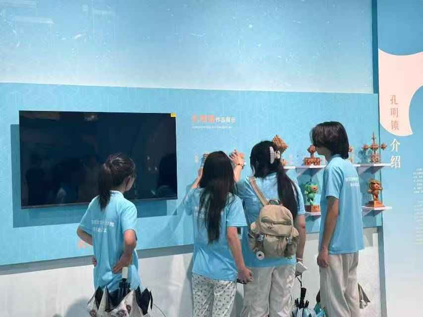 隊員們步入蘭溪市文化館,來到二樓展廳,目光瞬間被大廳陳列的蘭溪非遺展品牢牢吸引:榫卯精巧的孔明鎖透著古趣,紅紙裁就的剪紙紋樣靈動鮮活,墻上懸掛的戲曲人物畫像衣袂翩躚,眉眼間仿佛藏著攤簧小調的婉轉韻味。