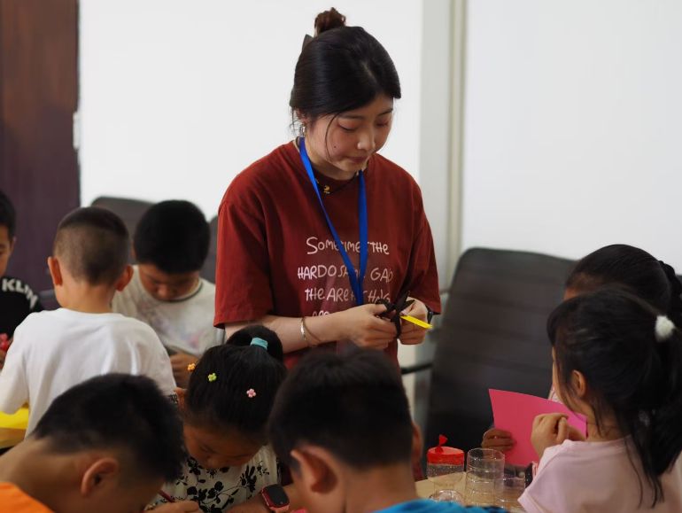 (志愿者幫助小朋友制作 供圖劉晶晶)