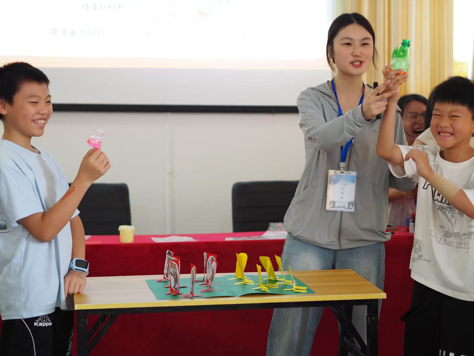 活動伊始,實踐隊員以“看不見的力量”為切入點,向孩子們拋出問題:“空氣能像炮彈一樣發(fā)射嗎?”隨后,團隊成員利用廢舊水瓶、氣球和膠帶制作簡易“空氣炮”,通過拉拽氣球噴射空氣漩渦擊倒紙杯塔。這一神奇的現(xiàn)象瞬間吸引了孩子們的目光,他們紛紛舉手,迫不及待地想要親自嘗試操作。“原來空氣真的有力量!就像隱形的大手!”孩子們興奮地說道,眼中閃爍著對科學(xué)的驚嘆與好奇。在孩子們沉浸于科學(xué)實驗帶來的驚喜時,實踐隊員巧妙地結(jié)合實驗現(xiàn)象,用通俗易懂的語言講解了伯努利原理和氣壓知識。他們引導(dǎo)孩子們思考生活中的類似現(xiàn)象,如“為什么地鐵站要設(shè)置安全黃線”“電風扇為什么能吹出風”。通過“觀察—實踐—聯(lián)想”的教學(xué)設(shè)計,將原本抽象的科學(xué)知識被轉(zhuǎn)化為可觸可感的實際體驗,孩子們在輕松愉快的氛圍中,逐步揭開了科學(xué)的神秘面紗。