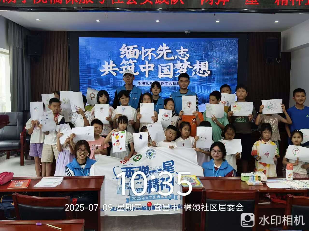 7月9日在宜昌市秭歸縣橘頌社區,武漢東湖學院橘徠服兮實踐隊于清晨8:30開啟了一場以“緬懷先志,共筑中國夢想”為主題的宣講活動,將科學報國的光芒灑向社區愛心托管班。