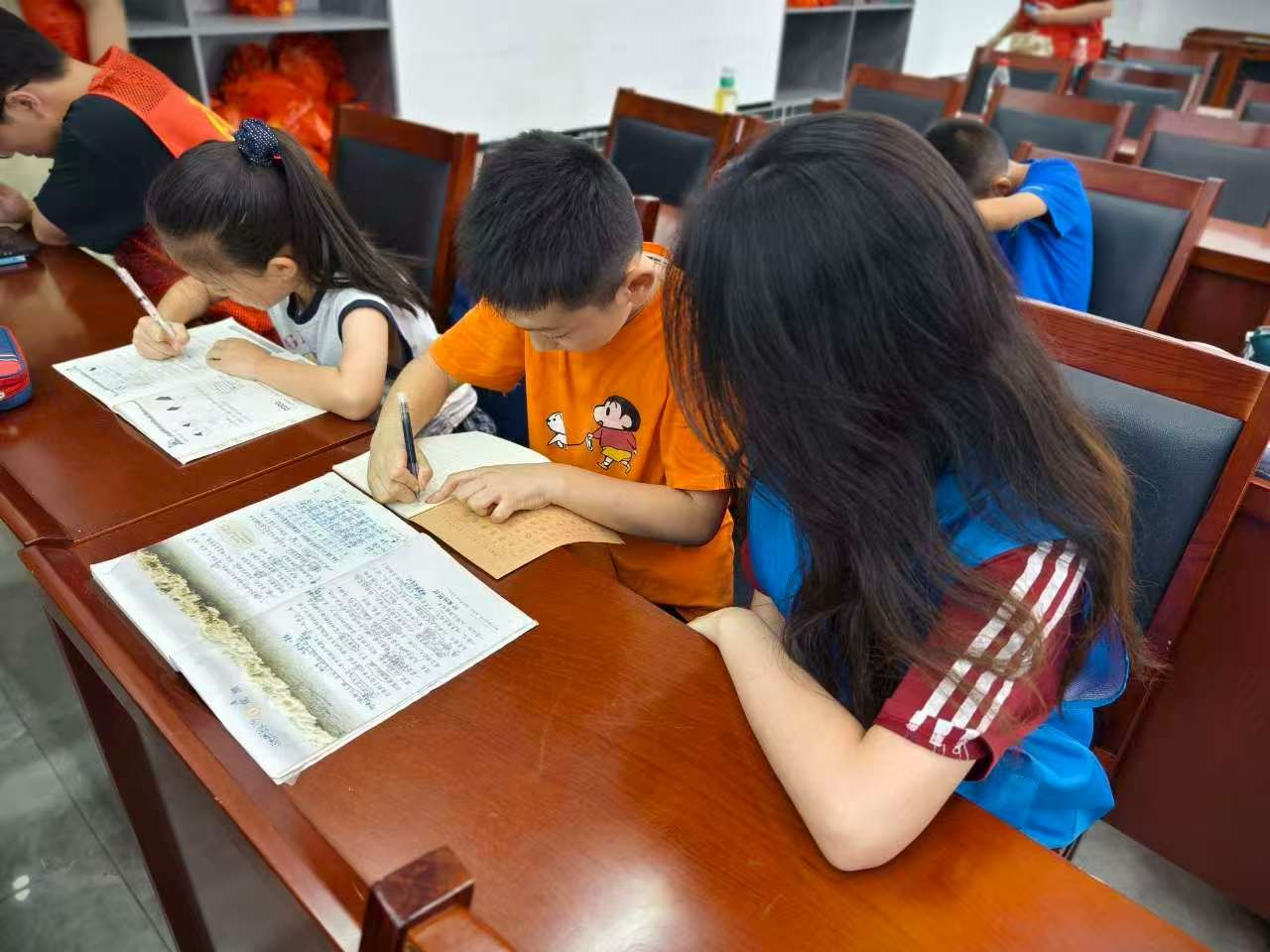 (實踐隊隊員輔導作業)繼上午深刻感人的“兩彈一星”精神宣講后,7月9日下午14:00武漢東湖學院橘徠服兮實踐隊持續發力,在宜昌市秭歸縣橘頌社區開展了富有意義的課后助學服務與觀影活動,將關懷與精神滋養播撒進社區青少年的心田。