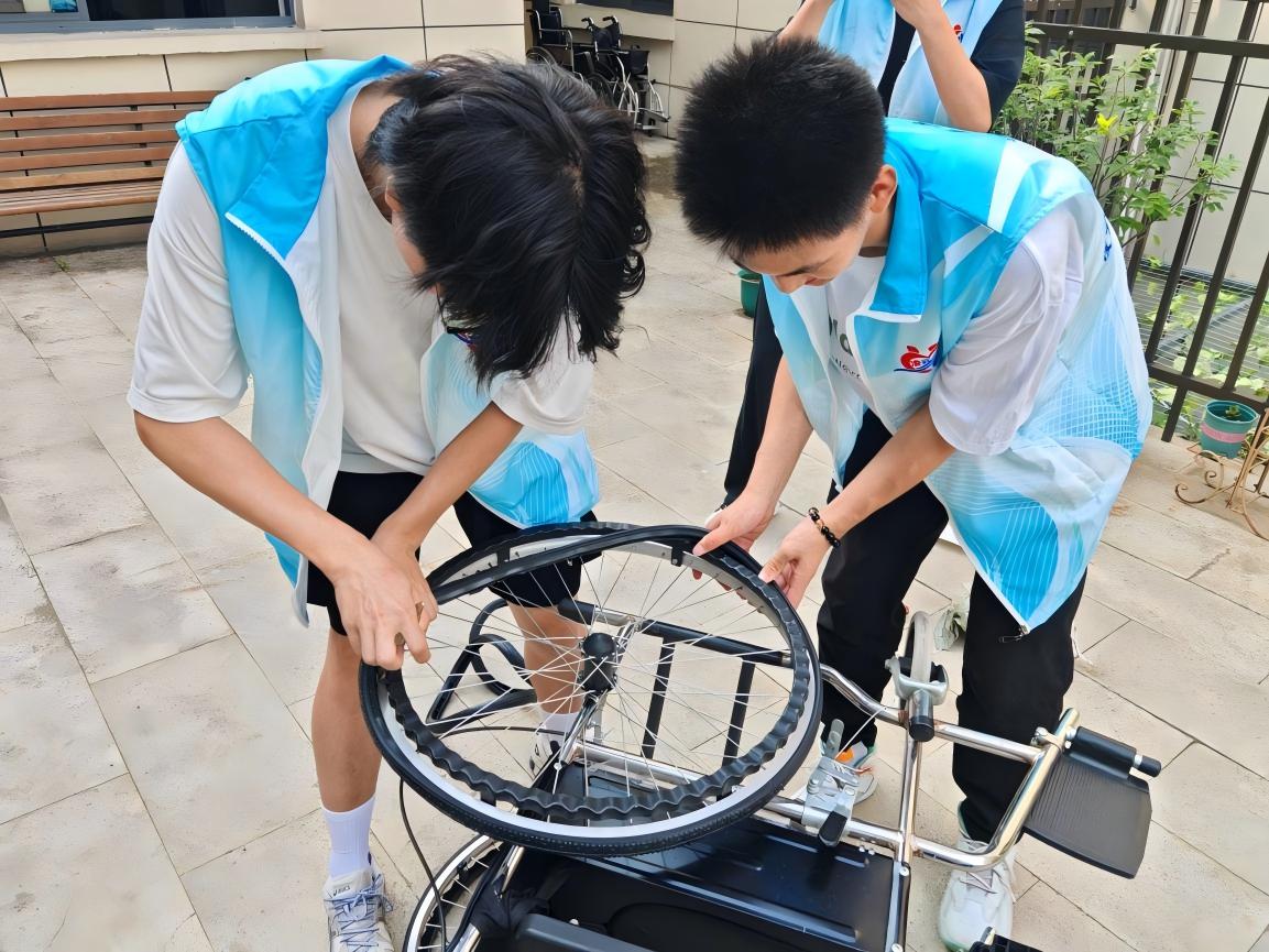 院子角落里,志愿者們正跟輪椅"較勁"。當負責人把壞掉的輪椅拿出來,他們就趕緊上去修。陽光下,他們額頭的汗珠亮晶晶的。誰能想到,課堂上學的理論知識到了這里,都變成了讓輪椅更穩、更安全、更舒服的竅門。這些年輕的汽車“修理工”知道,無論是修汽車還是修輪椅,核心都是讓“乘坐者”走得安穩——這份專業里藏著的,從來都是對人的在意。他們手里的工具叮當響,像在奏一首"修理交響曲"