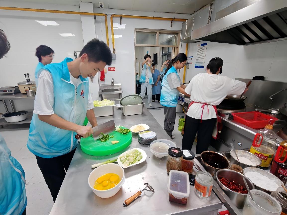 后廚的煙火氣最是熱鬧。志愿者們穿著凌云的志愿服,圍在水池邊忙。養老院的護工王阿姨正教志愿者小沈切蔥:"切得細點,這樣才入味。"而小吳卻幫忙炒菜,"多翻翻這樣才容易熟。"阿姨叮囑道。菜刀剁在菜板上的"咚咚"聲,水龍頭的"嘩嘩"聲,還有忍不住的笑聲,混著漸漸濃起來的菜香,把"日常"兩個字泡得軟軟的。誰也沒說什么豪言壯語,可看著老人們滿足的樣子,志愿者們忽然明白,所謂奉獻,有時就是把菜切得勻一點,把菜洗得凈一點,把日子過得暖一點。