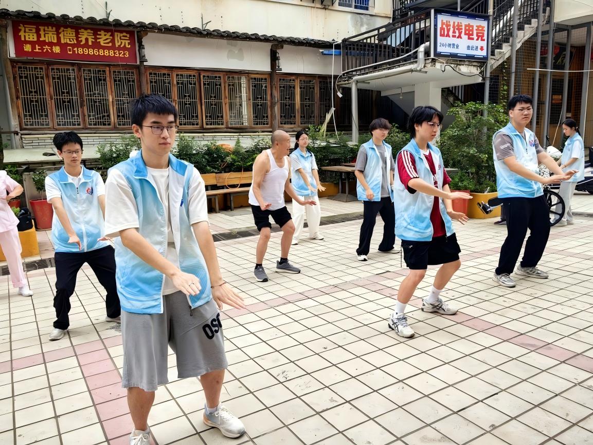 上午的陽光剛漫過養老院的石階,志愿者們穿著藍馬甲,在院子里站成一小排。"爺爺奶奶,我們給您演示套武當九式,您看著樂呵樂呵就行!"小吳話音剛落,舒緩的音樂就飄了起來。
