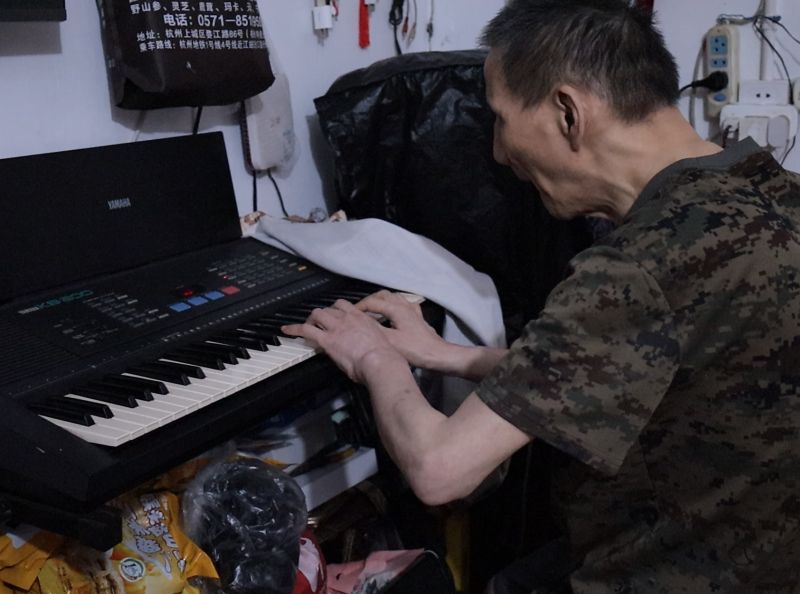 采訪結束后,湯叔叔主動拿出小號和電子琴,詢問大家喜愛的曲目并現場演奏。沒有專業的技巧、沒有旁人的指導,雙目失明的湯叔叔能彈出流暢的曲子,靠的是自己的一步步摸索。