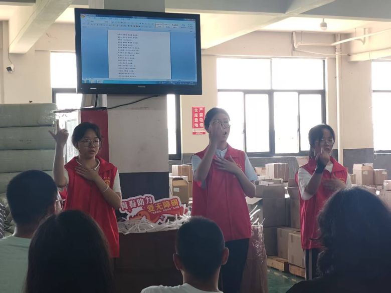 本次活動前期,實踐團(tuán)特邀學(xué)校手語社陳老師開展“手語傳情”社會實踐課程,為成員系統(tǒng)教授手語知識。課堂上,陳老師從手語的基礎(chǔ)理論講起,詳細(xì)介紹了手語的發(fā)展歷程及其在殘障群體日常交流中的重要性。隨后,通過生動形象的示范,帶領(lǐng)同學(xué)們學(xué)習(xí)日常問候語、數(shù)字、地名、簡單動作指令等實用手語詞匯以及后續(xù)將為善達(dá)未來蕭山區(qū)助殘扶貧科創(chuàng)園工作人員講授的倉儲相關(guān)工作用語。