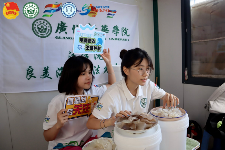 青春帶貨,讓海蜇走出鄉村 下午,電商組的隊員們準時來到布置妥當的直播場地,一場助力海蜇銷售的首次直播正式拉開帷幕。