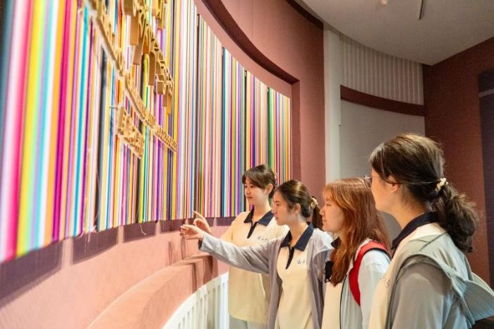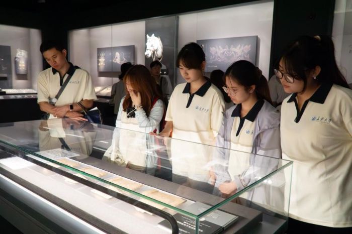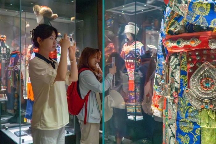 在博物院南館(藏文化主題館)民族服飾與卡墊藝術(shù)展廳,隊員們參觀展廳內(nèi)展陳的安多、康巴、衛(wèi)藏、僧侶四大類代表性藏服和我國其他各民族的服飾,體悟游牧文明與農(nóng)耕文明交融的服飾美學(xué)。