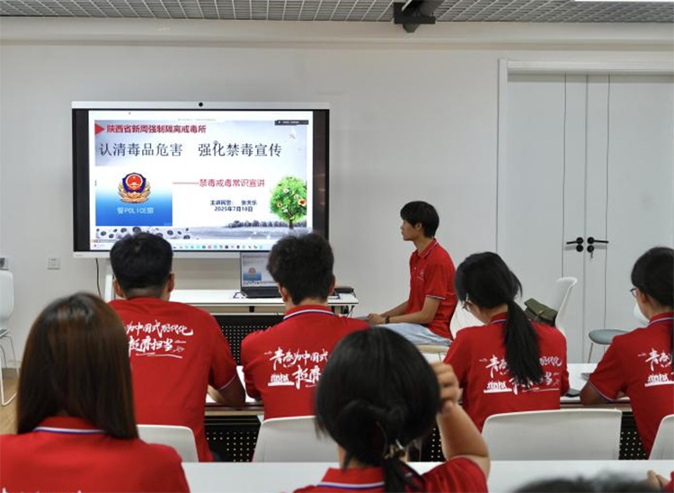 翌日,在雁塔校區(qū)黨建活動(dòng)中心,實(shí)踐團(tuán)成員與陜西省新周強(qiáng)制隔離戒毒所開(kāi)展以“認(rèn)清毒品危害,強(qiáng)化禁毒宣傳”為主題的線上座談會(huì)。