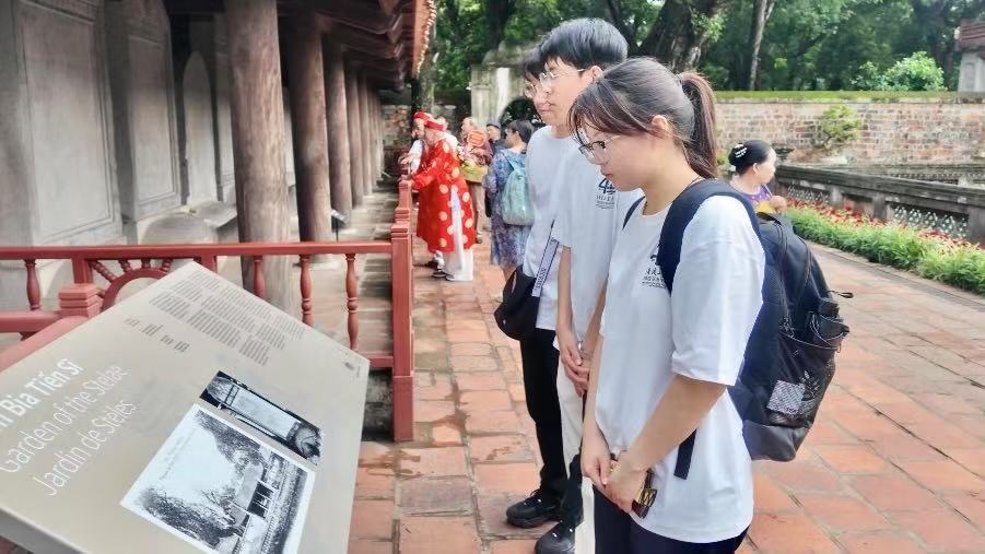 (二)在觸摸文化根脈的交流中增強文化自信實踐隊走進河內國子監文廟,這座始建于 11 世紀的文化地標,留存著中越文化交融的千年印記。隊員們在古色古香的院落中駐足,觀賞碑刻上的漢字典籍,聆聽當地學者講述越南科舉制度與中國文化的淵源。從建筑風格到禮儀習俗,從文字傳承到思想影響,處處可見中華文明與越南文化的互鑒共生。
