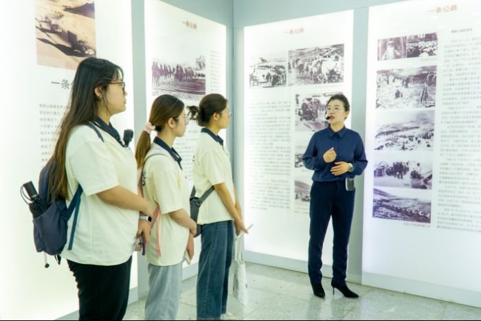 在講解員的帶領下,實踐隊師生參觀學習了“一位將軍”“一條公路”“一個奇跡”“一段歷史”“一座新城”五個板塊主題展,了解筑路大軍在財力匱乏、技術短缺、自然環(huán)境極為惡劣的情況下,齊心協(xié)力征服重重天險,創(chuàng)造公路建設史上的奇跡,以及青藏公路與格爾木市的不解之緣。館內(nèi)陳列展出的的格爾木第一批住房“帳篷”、慕生忠將軍種下的第一棵樹照片、慕生忠將軍插在格爾木的鐵鍬模型,讓實踐隊深刻了解了青藏公路從零到有的筑路歷程,身臨其境般體驗到青藏公路修建的艱辛。