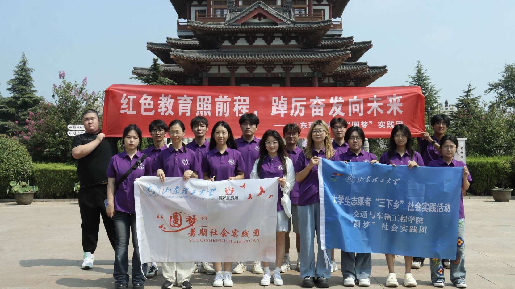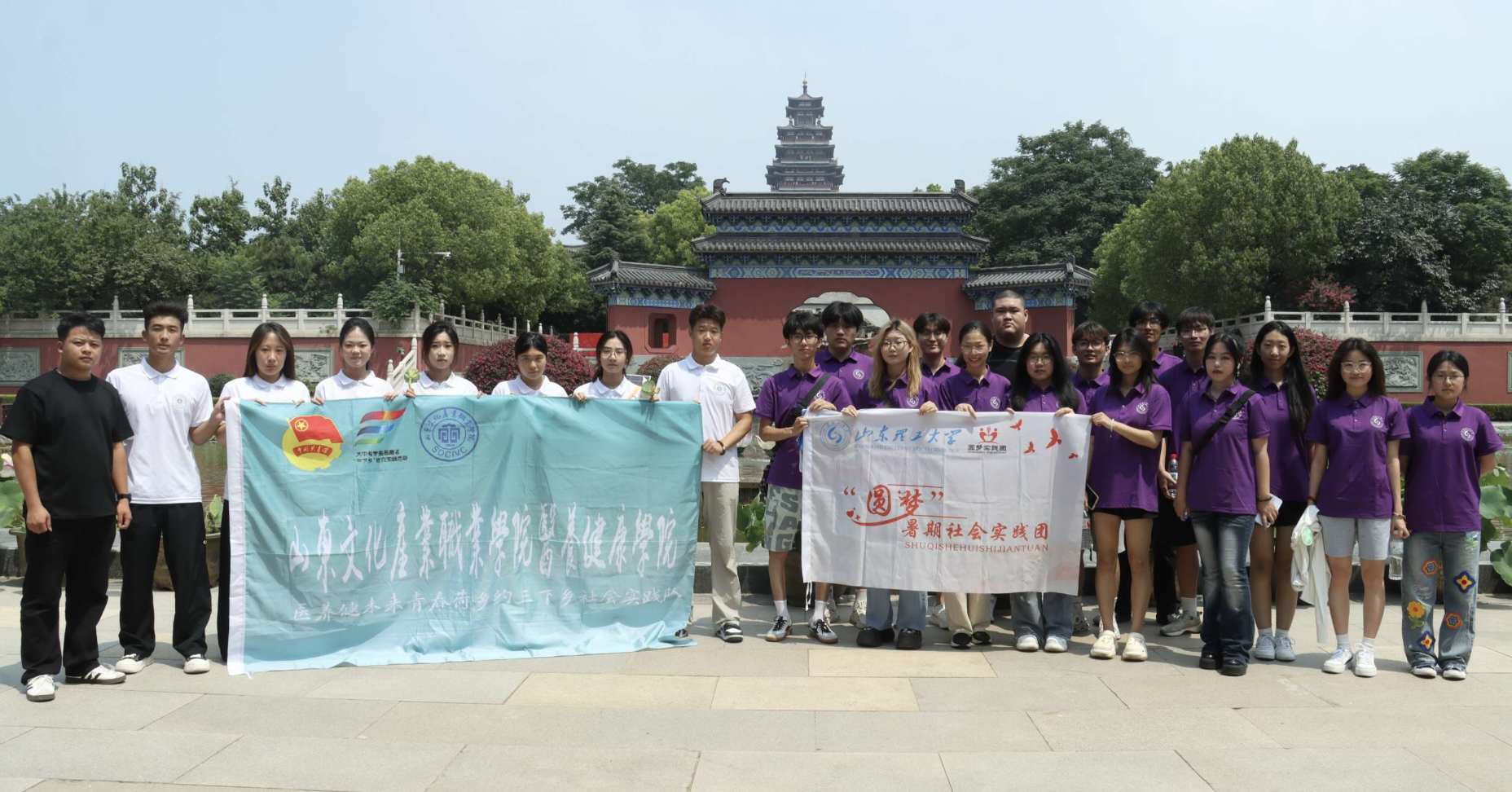 實踐團一行來到望湖塔下。這座通體呈青灰色的塔樓拔地而起,塔身層層收窄,頂端的寶剎在陽光下熠熠生輝。而正當大家準備聆聽導游介紹望湖塔的歷史時,意外地遇到了同樣來此開展社會實踐活動的山東文化產(chǎn)業(yè)職業(yè)學院的實踐團成員。兩校實踐團成員相見甚歡,紛紛熱情打招呼,短暫交流后得知,雙方都希望通過此次微山島之行,深入了解當?shù)匚幕S富了實踐經(jīng)歷。隨后大家在微子文化苑門前一同合影,共同紀念此次文化之旅。