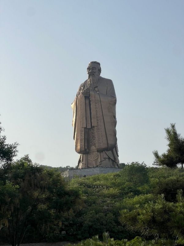 當實踐隊員踏入尼山圣境,最先闖入視野的,是那座矗立山巔的72米高孔子像——72米的高度暗合孔子弟子七十二賢之數(shù),他身著垂落的寬袖長袍,雙手交疊于胸前,衣袂似有微風拂過般微微揚起。雕像面容溫和中透著莊重,俯瞰著這片孕育了儒家文化的土地。實踐隊員們表示:站在孔子像下仰望,山風穿過松林的簌簌聲里,竟似能聽見“三人行必有我?guī)?rdquo;的箴言在回響,一股莫名的敬畏感從心底升起,仿佛與兩千多年前的先哲完成了一場無聲的對話。