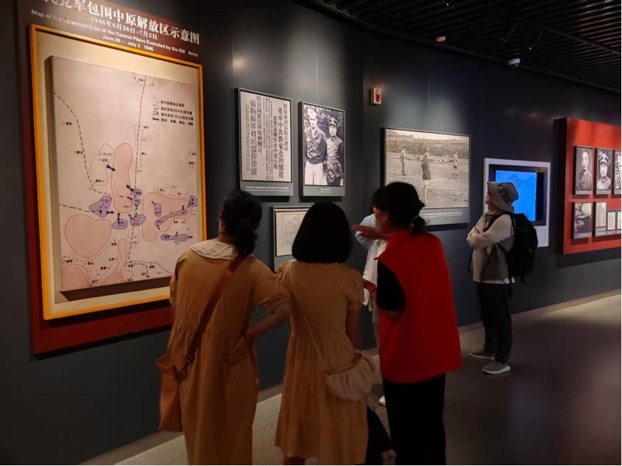 推開黑漆木門,周恩來同志1946年鏗鏘宣言“只要不背叛人民,永遠依靠人民,我們在中國的土地上就一定會有出路!”赫然呈現于誓言墻(圖4)。斑駁字跡如刻入磚石的信仰密碼,與展廳中央的《中原解放區示意圖》形成時空對話。這幅泛黃的戰略地圖(圖3)配合動態沙盤,無聲演繹著解放戰爭時期民心向背的歷史邏輯。