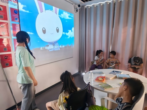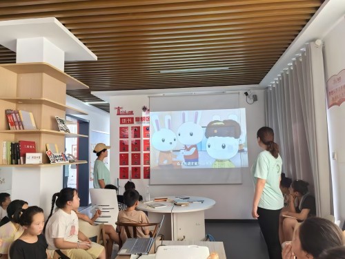 圖為實踐團成員與同學(xué)們觀看視頻