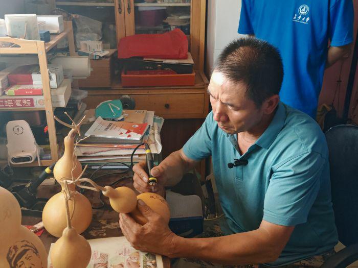 最后,實踐隊員們來到了非遺傳承人胡文明先生的家中,立即被眼前陳列的精美葫蘆雕刻作品所震撼。這些承載著傳統技藝的工藝品整齊陳列,每一件都凝聚著匠人的心血與智慧。