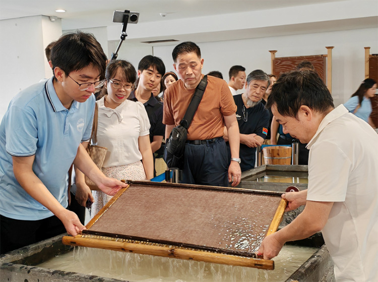 團(tuán)隊成員在了解宣紙制作工序的難度后,在師傅指導(dǎo)下進(jìn)行體驗。撈紙時,成員手持竹簾操作,發(fā)現(xiàn)力度極難掌控,初次撈出的紙張厚薄不均、形狀扭曲,與傳承人制作的紙張差距明顯。通過此次體驗,團(tuán)隊成員了解到宣紙制作各工序的重要性,以及背后匠人長期的辛勤付出和精益求精的態(tài)度。宣紙作為中華民族智慧的結(jié)晶,承載千年文化底蘊,每張紙都來之不易,應(yīng)重視并傳承這一文化遺產(chǎn)。