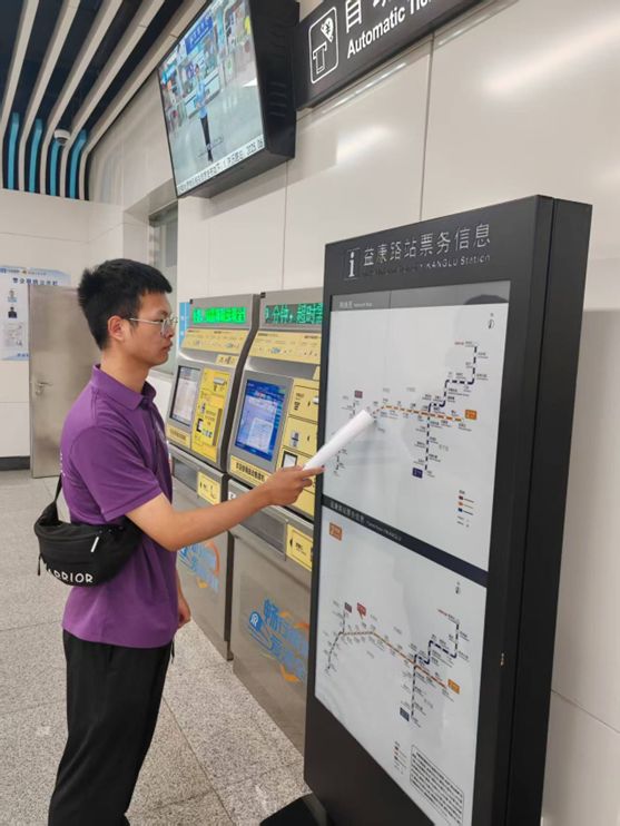實踐團成員采用“觀察+體驗+隨機采訪”模式,重點記錄各站點動態導視系統、盲道及無障礙電梯等設施的配置與使用情況。針對換乘通道長度、標識牌及多語言提示等細節,成員通過步行計時、多角度拍攝等方式留存實證資料。同時,團隊隨機選取不同時段乘坐2號線,實地測算高峰時段站內換乘耗時。