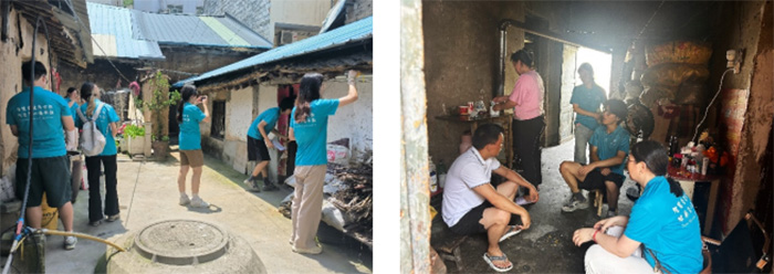 實踐隊在石鎮村老街測量數據、與村民交談(來源:成員自攝)